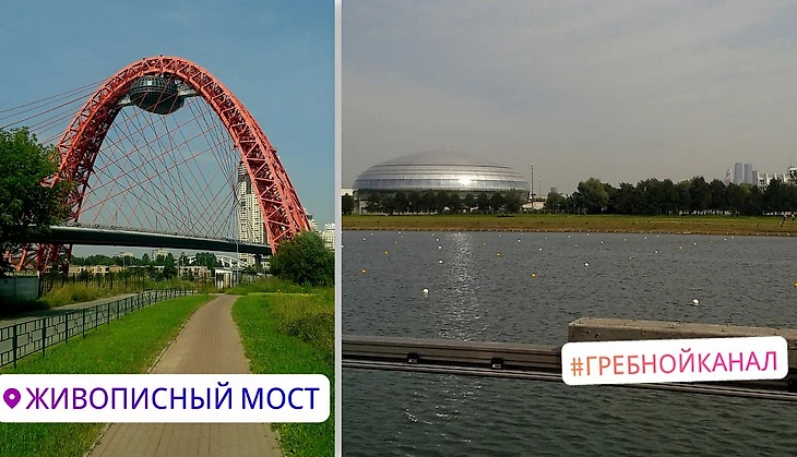 Дальше дорога уходит от реки, мимо дач и каких-то высоких заборов по лесу выезжаем к Крылатской улице, там какой-то военный объект, вроде что-то про танки, мы едем в другую сторону, к гребному каналу. Заезжаем на территорию Крылатского через парк «Сказка», там кстати расположено колесо обозрения с шикарным видом на реку, канал и Живописный мост (вот та круглая штука сверху это ЗАГС). Сворачиваем к гребному каналу, пролезаем через дырку в заборе (а по другому с этого края на территорию не попасть). Делаем привал, обсуждаем как дальше поедем. Казак хочет к 19:30 успеть в Кузьминки, там у «Пончика» шашлыки. Таким образом, из маршрута выпадают природный заказник долины реки Сетунь (он не особо bike –friendly), парк 50-летия Октября (он просто не особо) и Воронцовский парк (он не по пути совсем). Гоним вдоль канала, отличное место, которое прям заражает желанием заниматься спортом. Справа остаются центральный офис adidas, ледовый дворец, крытый велотрек, открытая велотрасса по холмам (но я лично че-то очкую там кататься), слева за каналом красавец дворец спорта Динамо – стеклянное круглое здание. Узнали новый вид спорта – кануполо, это как водное поло, только на каяках и ворота висят на высоте 2 метра над водой. Посмотрели минут 5 и поехали дальше, в Суворовский парк.