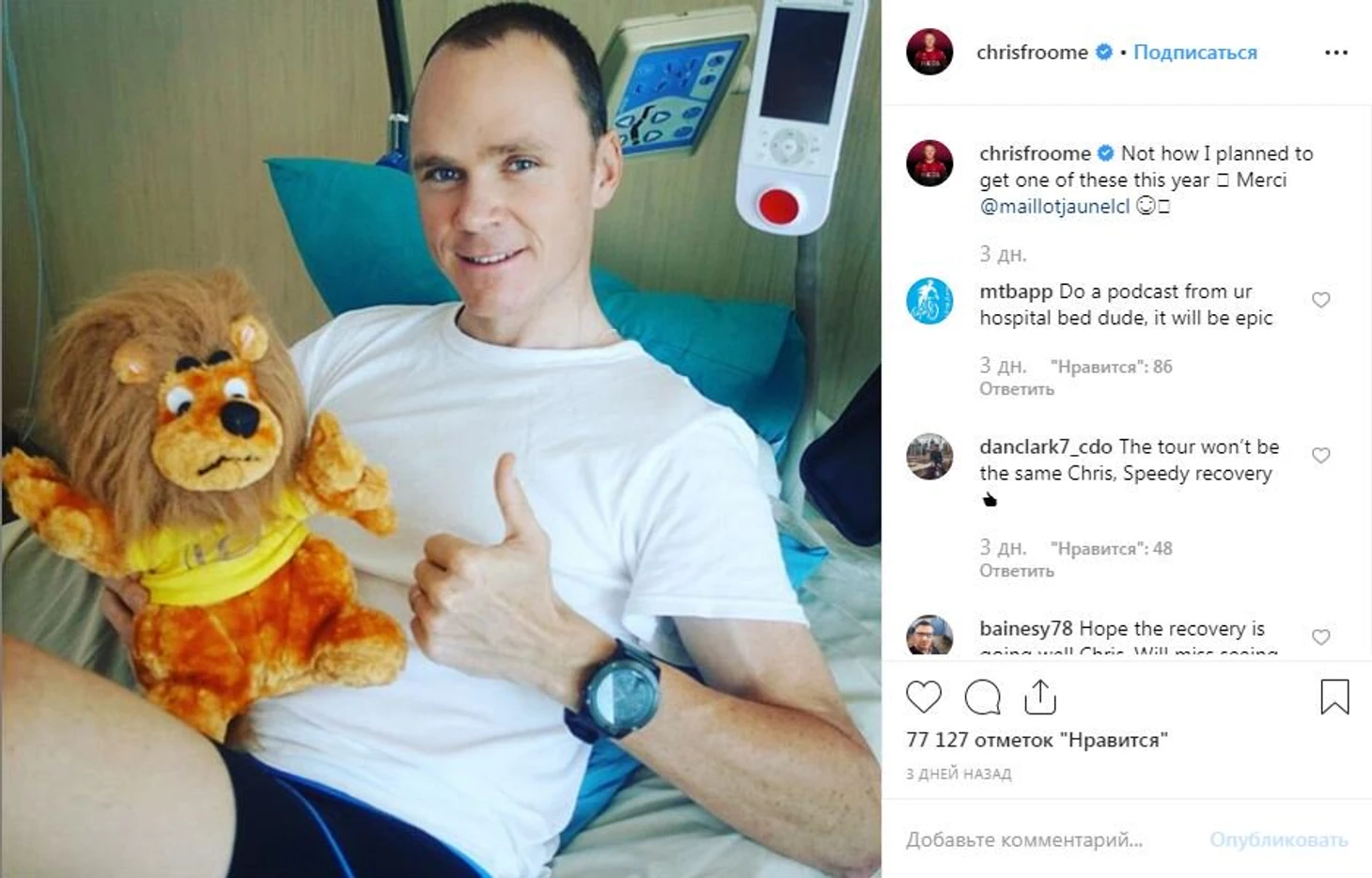 Только вот все равно уже в первый день присутствует ощущение недосказанности; понимания, что не хватает кого-то очень значимого. Не стартует захворавший Кавендиш, не хватило места в заявке Жильберу, колено Гавирии передало привет сезонным амбициям колумбийца, туманом окутаны перспективы Киттеля как спортсмена... Все это, конечно, ощутимые для Тура потери, но главная проблема заключается в другой персоне. Конечно же, ощущение пустоты связано с отсутствием пятикратного победителя ТДФ Криса Фрума, получившего серьезную травму в начале июня. Но, согласитесь, есть подозрение, что таким раскладом были довольны все, кроме велогонщика. В «Инеос» теперь не надо разрываться между тремя лидерами («Мувистар» многое может рассказать о сомнительной успешности данной тактики); руководство ТДФ с облегчением не увидит гонщика с запятнанной репутацией; а самые адекватные болельщики велоспорта выберут себе новые целя для забега с баночками с известным содержанием. Вот оттого и получается таким грустным фото в инстаграме тоскующего Криса с плюшевым львенком.