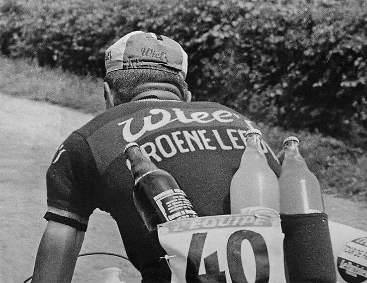 Раньше же велоспорт был совсем другим. Вот хороший пример с «Тур де Франс»-1963 – чтобы охладиться и перекусить, спортсмены сами забегают в бистро в небольших населенных пунктах по дороге. Они берут... нет, вовсе не воду – на дистанции велосипедисты любили охладиться шампанским, пивом или красным вином, вполне могли делиться друг с другом напитками, которые успели взять.