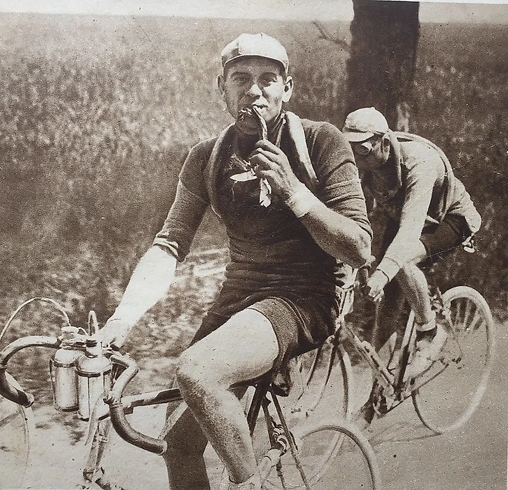 Рацион был мощный – победитель Тура 1904 года Анри Корне (Henri Cornet) литрами употреблял горячий шоколад, шампанское, чай, заедая это килограммами рисового пудинга. В ход шли листья коки (дебютировала в Туре 1914 года «как невероятно стимулирующее средство»). Гонщики ели багеты, перепелов и даже бананы с кожурой, на фото видно, как они хорошо заходят.