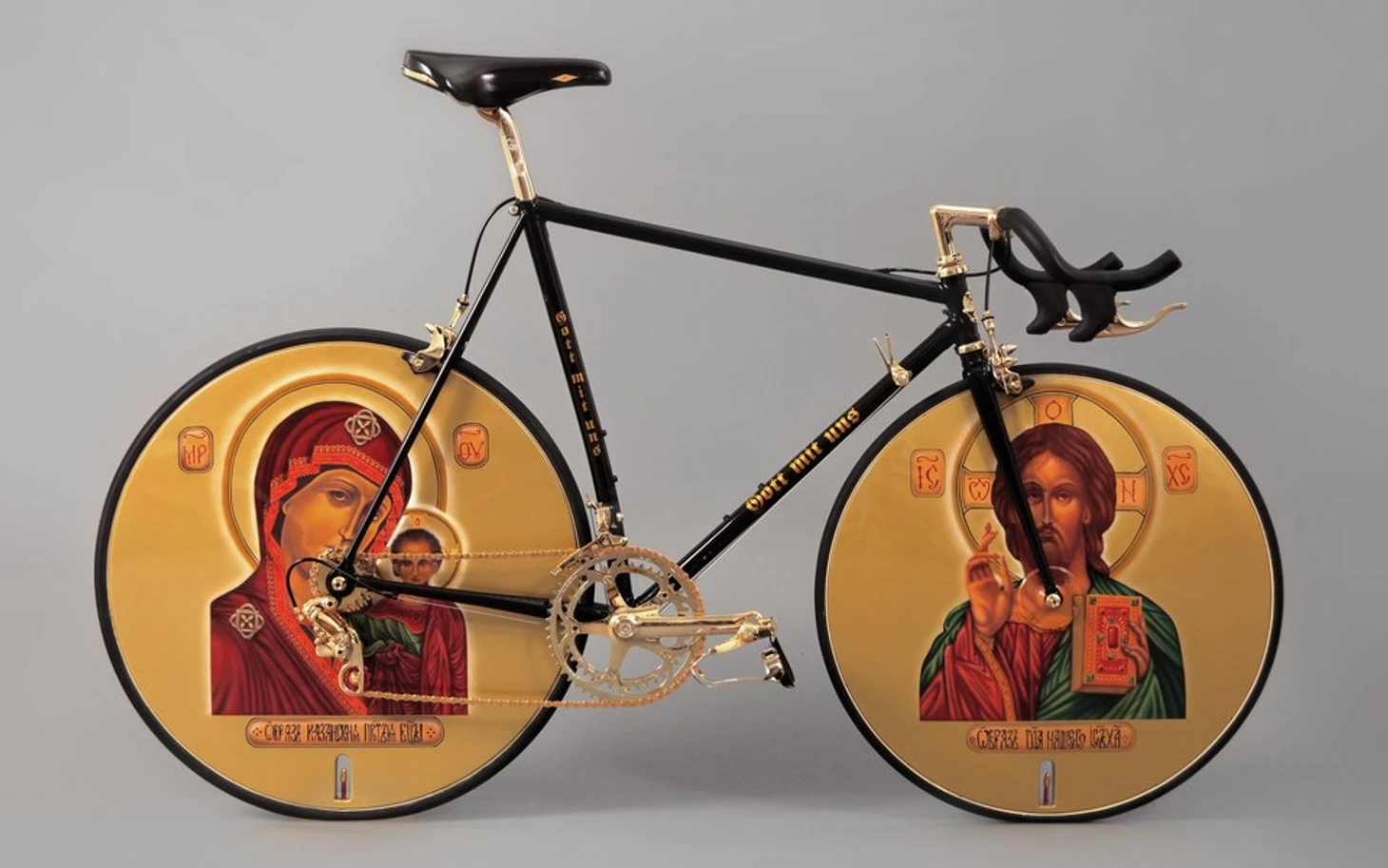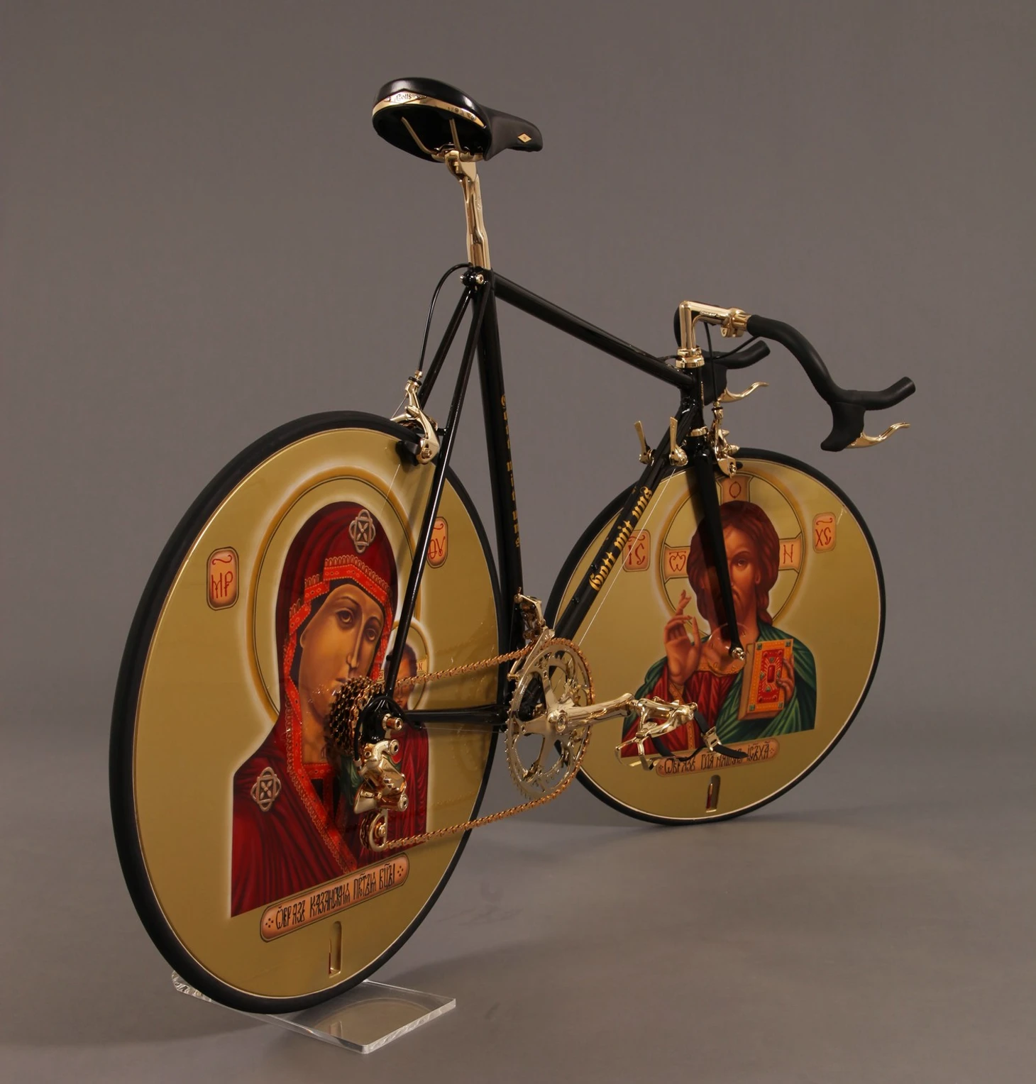 На заднем диске Mavic Challenger – Богоматерь Путеводительница (Одигитрия). К иконам этого типа относятся чудотворные Тихвинская, Смоленская, Ченстоховская, Троеручица, Споручница грешных, а также Казанская, по мотивам которой сделана роспись.