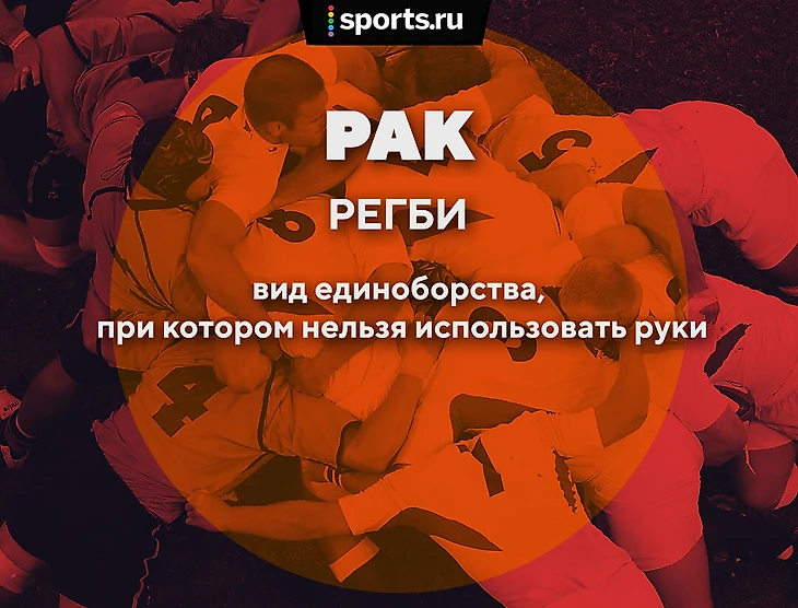 РАК (регби) – единоборство, когда мяч между двумя игроками, к ним присоединяются и другие – но только со стороны своих зачетных линий. Использовать руки нельзя, каждая сторона толкает мяч назад с помощью ног, чтобы потом возобновить атаку.