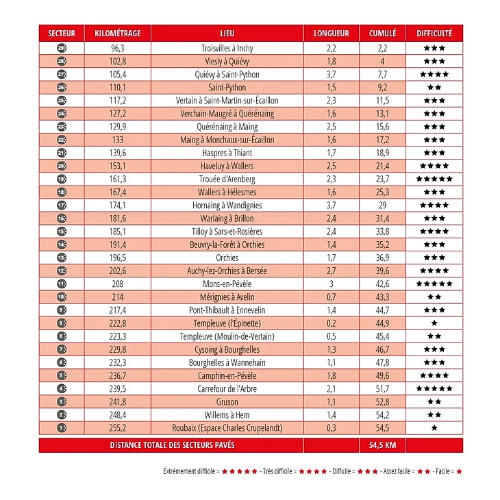 Все 29 секторов брусчатки имеют рейтинг сложности: от 1 до 5 звезд. Чем больше звезд, тем сложнее считается сам участок, при этом учитывается не только протяженность самой мощеной дороги, но и качество покрытия. Максимальные пять звезд привычно получили лишь три участка «паве», и именно на них традиционно разворачиваются ключевые события гонки.