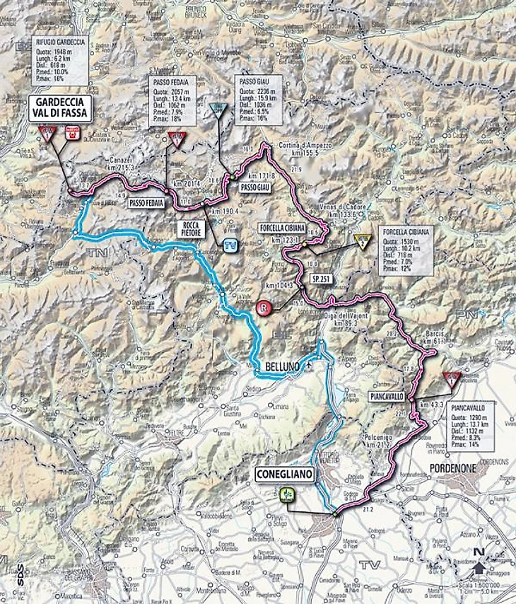 18.19 За 39 км до финиша лидер этапа Стефано Гардзелли начал восхождение на Пассо Федайя. 11 км в гору со средним градиентом 8,3 процента, максимальным – 18!
