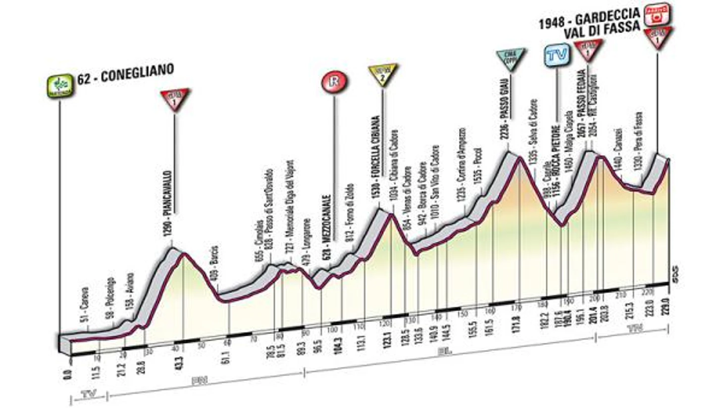 14.25 Тем временем, лидирующая группа преодолела первую гору Пьянкавало на 43-м километре трассы. Селло получил 15 очков в зачет, Хугерланд – 9, Попович – 5, Сеелдрайерс – 3, Арамендиа – 2, Кучинский – 1.