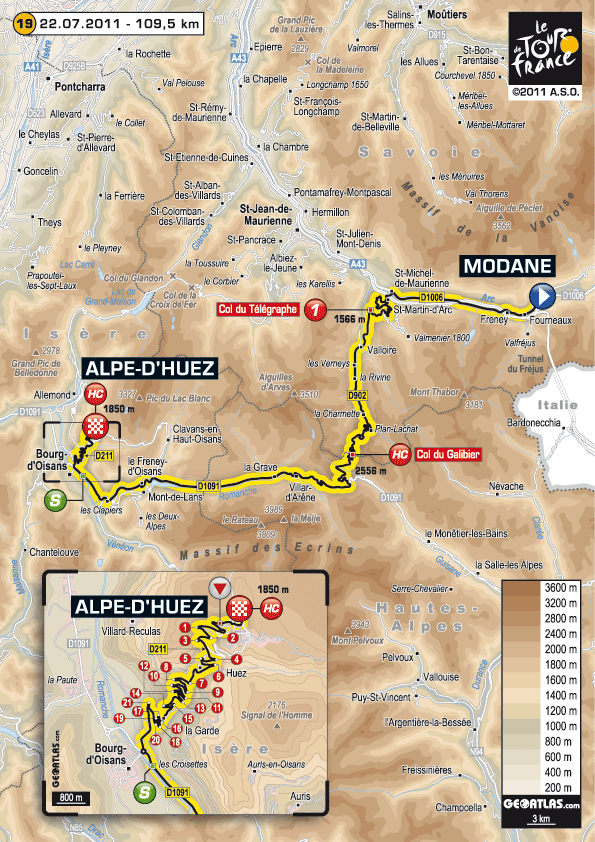 26,5 км – Телеграф (1 566 м) – 11,9 км длина подъема первой категории с градиентом 7,1% 48,5 км – Галибье (2 556 м) – 16,7 км длина подъема высшей категории с градиентом 6,8% 109,5 км – Альп-д’Юэз (1 850 м) – 13,8 длина подъема высшей категории с градиентом 7,9%