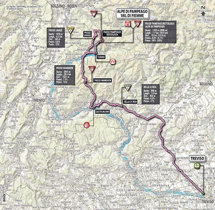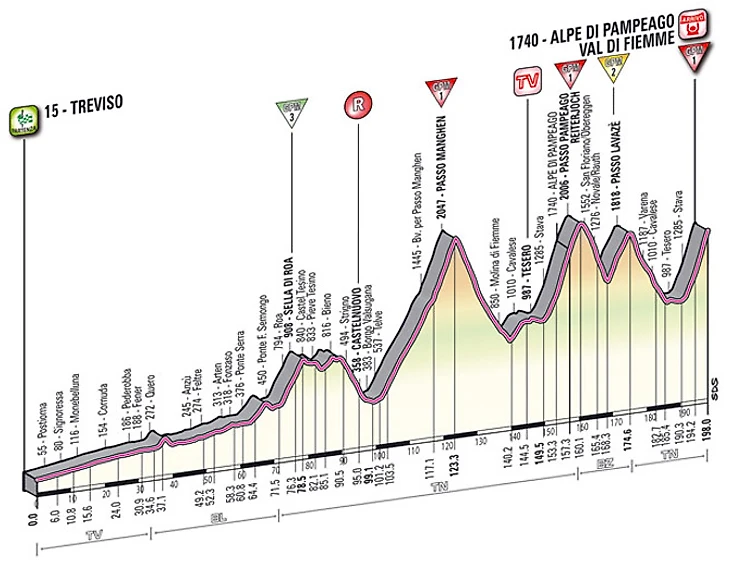 15.09 Длина сегодняшнего этапа – 197 км. Первая часть равнинная (около 72 км), а затем начинаются горы. После разминочной вершины 3-й категории гонщики поднимутся на Пассо Манген (2047 м), затем – на Пассо Пампеаго (2006 м) и на Пассо Лаваце (1818 м). После спуска гонщикам предстоит горный финиш 1-й категории.