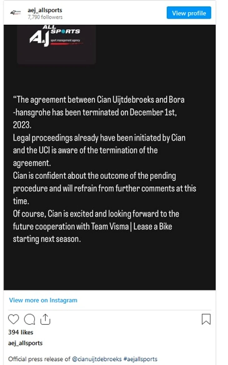 Представляющее интересы Эйдтебрукса агентство «A&J All Sports» опубликовало стерильный пресс-релиз: «Соглашение между Кианом Эйтдебруксом и Bora-hansgrohe было расторгнуто 1 декабря 2023 года. Киан уже начал судебное разбирательство. UCI знает о расторжении соглашения. Киан уверен в итоге предстоящего процесса и пока воздерживается от комментариев. Конечно, Киан с большим нетерпением и радостью ждет будущего сотрудничества с командой Visma|Lease a Bike, начиная со следующего сезона». Сам UCI, как в меме про собачку в горящем доме, все это время горделиво отмалчивается в надежде, что ситуация сама по себе рассосется. Но пока что атмосфера только лишь накаляется.