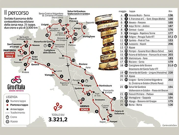 В предыдущие разы этот регион и непосредственно сам Турин принимали официальный старт Джиро в 1961 и 2011 году, когда отмечался вековой юбилей, а затем и 150-летие с момента Рисорджименто, то есть объединения Италии. О создании Итальянского королевства во главе с пьемонтским королем Виктором Эммануилом II было объявлено в Турине еще 17 марта 1861 года, но в Рим итальянские войска вошли только спустя почти десять лет. Король торжественно въехал в Вечный город только летом 1871-го, произнеся знаменитые слова: «Мы пришли в Рим и останемся в нем!». Город был официально объявлен новой столицей страны, а Папа, сохранивший за собой Ватиканский дворец, объявил себя «вечным пленником» итальянского государства.
