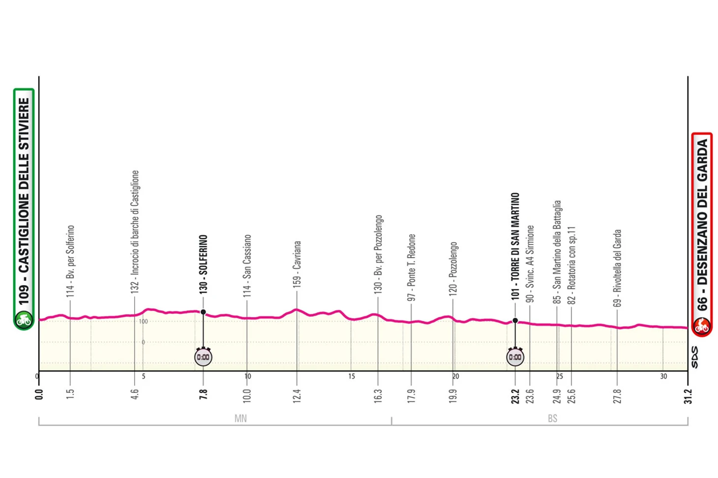 18 мая (суббота). Кастильоне-делле-Стивьере – Дезенцано-дель-Гарда, 31 км (индивидуальная разделка, сложность 3*). Трансляция: 14:00-18:45