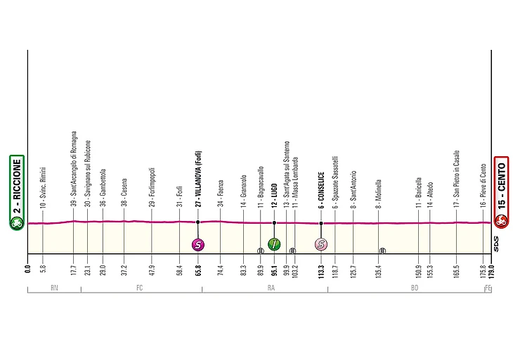 17 мая (пятница). Риччоне - Ченто, 179 км (равнинный этап, сложность 1*). Трансляция: 13:45-18:45 мск