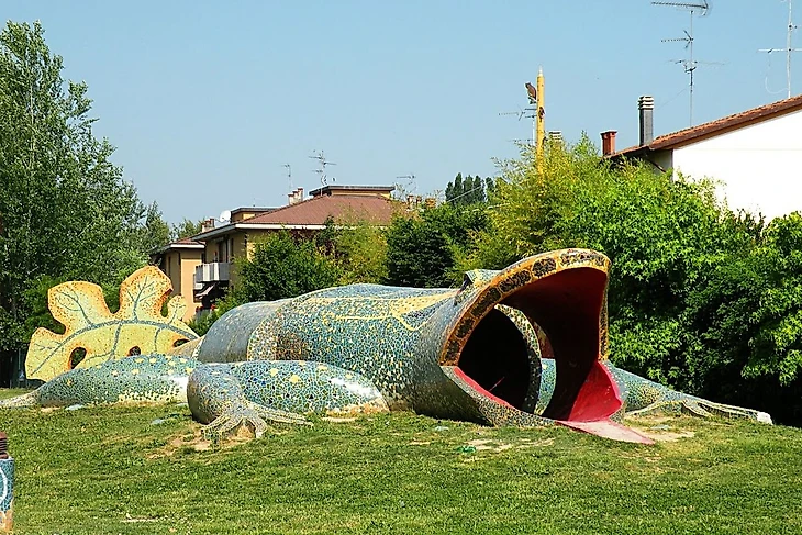 Парк в Ченто, конечно, не имеет таких масштабов, да и не претендует на соперничество с всемирно известной достопримечательностью. Он создан художником Марко Пелицоллой на основе сказки, которую написала его девятилетняя дочь. Для работы он привлек более двухсот студентов-художников пятидесяти разных национальностей, которые проходили стажировку по керамической мозаике. Так в саду появились 33-метровая ящерица на лужайке, 13-метровый дрозд на небольшом холме и 12-метровый лист, тянущийся к небу. Даже освещение было спроектировано так, чтобы фонарные столбы по цвету и высоте гармонировали с конструкциями.