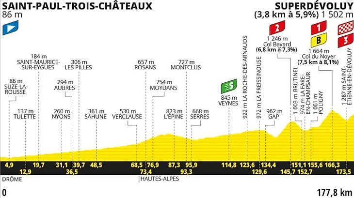 Развить или потерять добытое преимущество можно на финальном подъеме дня к зимнему курорту Супердеволю (3,8 километра со средним градиентом 5,9%). Правда, он достаточно короткий и пологий, поэтому если лидеры к его подножию приедут вместе, то скорее всего победа на этапе решится в финишном спринте, как это было, например, в Ле-Лиоране, где Вингегор на полколеса объехал Погачара. Супердеволю несколько раз входил в маршрут Критериум Дофине, но на Тур де Франс он дебютирует. Посмотрим, кто станет его первым покорителем на Гранд-Турах.