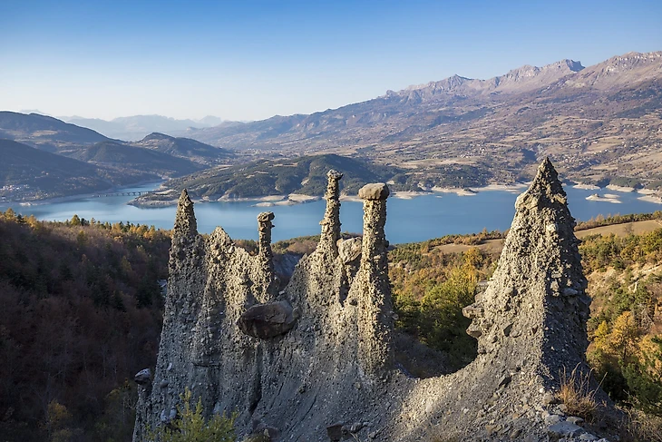 Особое изящество данному месту придает тот факт, что расположены эти природные творения на краю одного из крупнейших водохранилищ Европы Сер-Понсон. Идея его создания возникла после нескольких серьезных наводнений в долине, повлекших гибель десятков людей в середине XIX века. Однако, реализована она была лишь сотню лет спустя. Постройка плотины привела к тому, что долина постепенно заполнилась водой, затопив несколько деревень, в результате чего полутора тысячам людей пришлось покинуть свои дома.