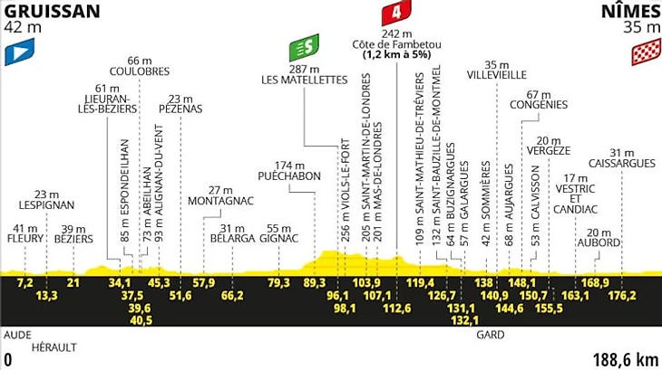 Стартуют из Грюиссана, который впервые в истории принимает у себя пелотон Тур де Франс в качестве города-организатора этапа. Хотя, например, та же Вуэльта в 2017-ом уже здесь финишировала, в спринтерском поединке выиграл бельгиец Ив Лампарт. А в минувшем году Грюиссан посетил и Тур Окситании – победил молодой Марейн ван ден Берг, который буквально пару недель назад стал ключевым помощником успеха Романа Барде на первом этапе Тура, принесшем ему заодно и желтую майку, пусть и всего на один день.