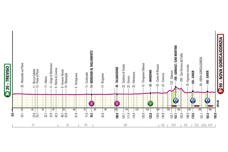 Из Тревизо, одной из малых родин всемирно известного игристого вина Просекко, которое в Италии употребляют по любому удобному случаю или даже без оного, пелотон отправится в северо-восточном направлении, чтобы через 195 километров финишировать на территории соседнего государства. И хотя Словении досталось меньше четверти всего субботнего пути, ключевые точки, если их так можно назвать, расположены именно там.