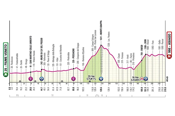 25 мая (воскресенье). Фьюме-Венето – Асьяго, 219 км (горный этап, сложность 4*). Трансляция: 12:15-18:45