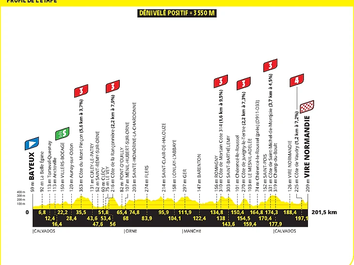 В четверг особый день для любителей настоящих холмистых классик. Маршрут протяженностью свыше 200 километров изобилует подъемами и спусками, и хотя полноценных гор в Нормандии не нашлось, общий набор высоты за день составляет порядка 3500 метров по вертикали, что вполне соответствует уровню среднегорного этапа. Неслучайно же эти места называют Нормандской Швейцарией, тем более, что и финиш будет также в подъем.