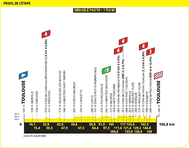 Сразу за ним последует восхождение на холм Кот-де-Пеш-Давид (800 метров со средним градиентом 12,4%), находящийся на самом юге финишного города с панорамным видом на Пиренеи. Именно через эту возвышенность проходит самая длинная городская канатная дорога Франции Teleo, соединяющая университет, больницу и онкоцентр Тулузы.
