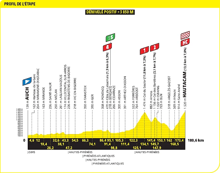 Впрочем, первая сотня километров, и даже чуть больше, совсем не будет похожа не классический пиренейский горный этап. Гонщики стартуют из гасконского города Ош, где находится статуя д’Артаньяна или Шарля де Батса де Кастельмора, реального капитан-лейтенанта мушкетеров, послужившего прообразом для одноименного персонажа романа Александра Дюма. Но герой книги значительно отличался от реального человека, поскольку некоторые жизненные истории и многие черты характера были списаны с отца Дюма.