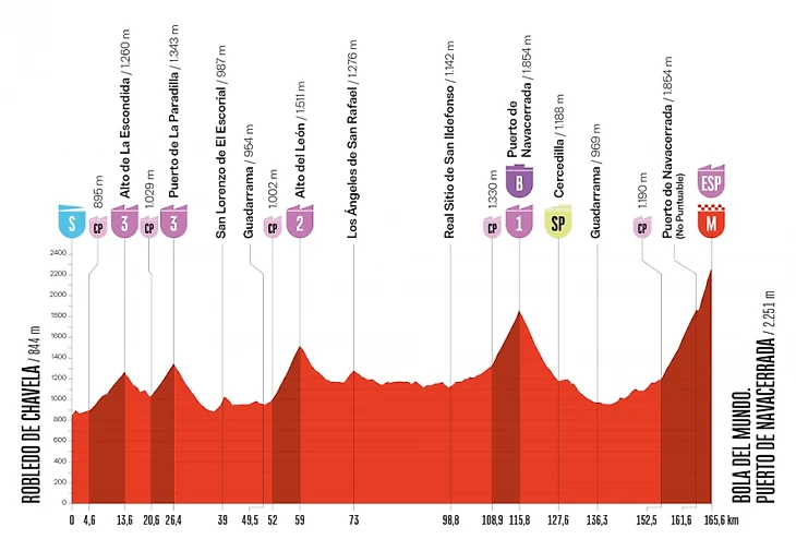В первый раз, примерно за 50 километров до финиша, Пуэрто-де-Навасерраду (6,9 километра со средним градиентом 7,6%) покорят с более щадящей северной стороны, разыграв при этом на вершине бонусные секунды. Во второй раз Пуэрто-де-Навасерраду (9,1 километра со средним градиентом 7,3%) будут проходить уже с юга. И мало того, что она сама по себе в таком варианте выходит значительно длиннее, но и никаких горных премий на ней не предусмотрено, поскольку подъем продолжится далее по бетонному покрытию на культовую макушку Бола-дель-Мундо (3,2 километра со средним градиентом 12,2%).