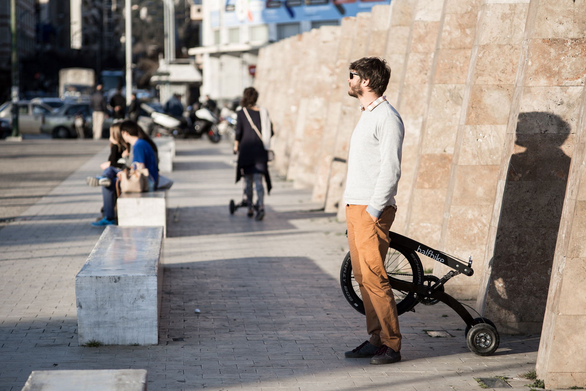 Kolelinia – это творческое объединение, участники которого занимаются разработкой альтернативных видов городского транспорта, расположенное в Болгарии. Именно они разработали, а также запустили производство Halfbike – компактного городского велосипеда очень нестандартной наружности.Внешне он немного напоминает Segway, но в отличие от него, Halfbike – трехколесный механический велосипед, очень удобный для перемещений по городу.Необычный велосипед используется в положении стоя, что обеспечивает хороший обзор в городе. Руль необходимо держать двумя руками, на нем также расположен тормоз. Чтобы выполнить поворот, нужно лишь слегка наклониться в сторону поворота. Легкий вес, небольшие размеры и хорошая маневренность делают Halfbike отличным транспортным средством для использования в городе.