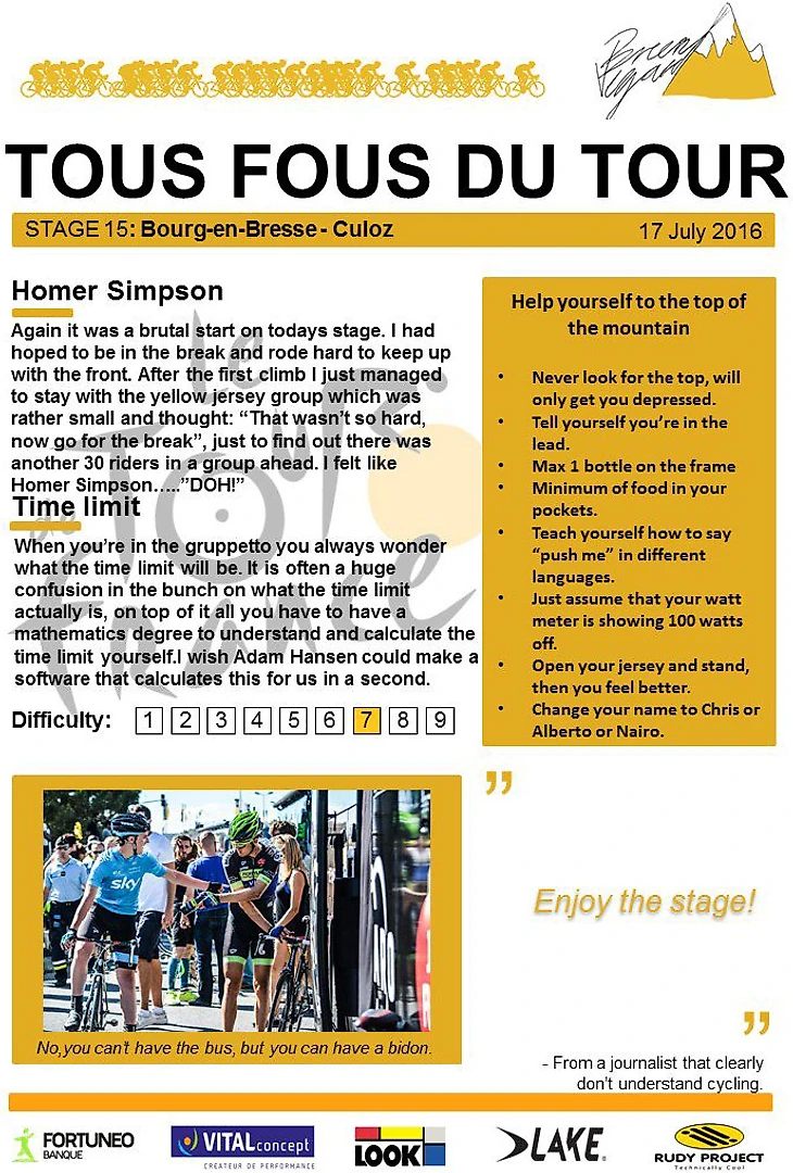 И снова начало сегодняшнего этапа было брутальным. Я надеялся уехать в отрыв и работал изо всех cил, чтобы держаться впереди. После первого подъема я сумел остаться в группе желтой майки, которая была довольно невелика, и подумал: «Это было не так уж сложно, сейчас попробую пойти в отрыв». И тут же обнаружил, что впереди меня другая группа из 30 гонщиков. Я чувствовал себя как Гомер Симпсон… DOH!
