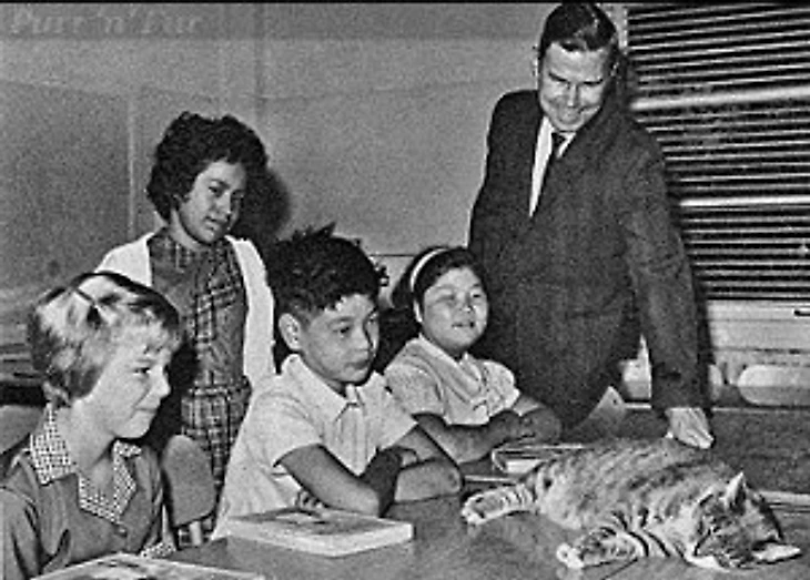 Если открыть старые фотоальбомы Элизиан Хайтс тех времен, но почти на всех общих фотографиях классов (примерно с 1952 по 1967) кот обязательно будет восседать на почетном месте посередине. Как официальный талисман школы, кот даже оставил на память потомкам отпечатки своих лап в мокром цементе перед зданием (в присутствии орды журналистов и не без помощи учителей :)).