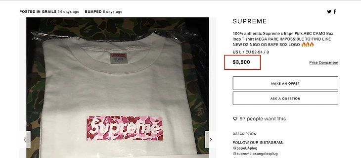 Если эта информация подтвердится, то можно смело ожидать огромный ажиотаж вокруг релиза вещей и совершенно космическую цену на рынке перепродажи. Например, футболка Supreme x Bape с прошлого релиза сейчас на перепродаже стоит 3500$. Такие цены обусловлены статусом брендов, редкостью подобных коллабораций и жестким лимитом желанных вещей, что в сумме создает огромный хайп и очереди в несколько тысяч людей.