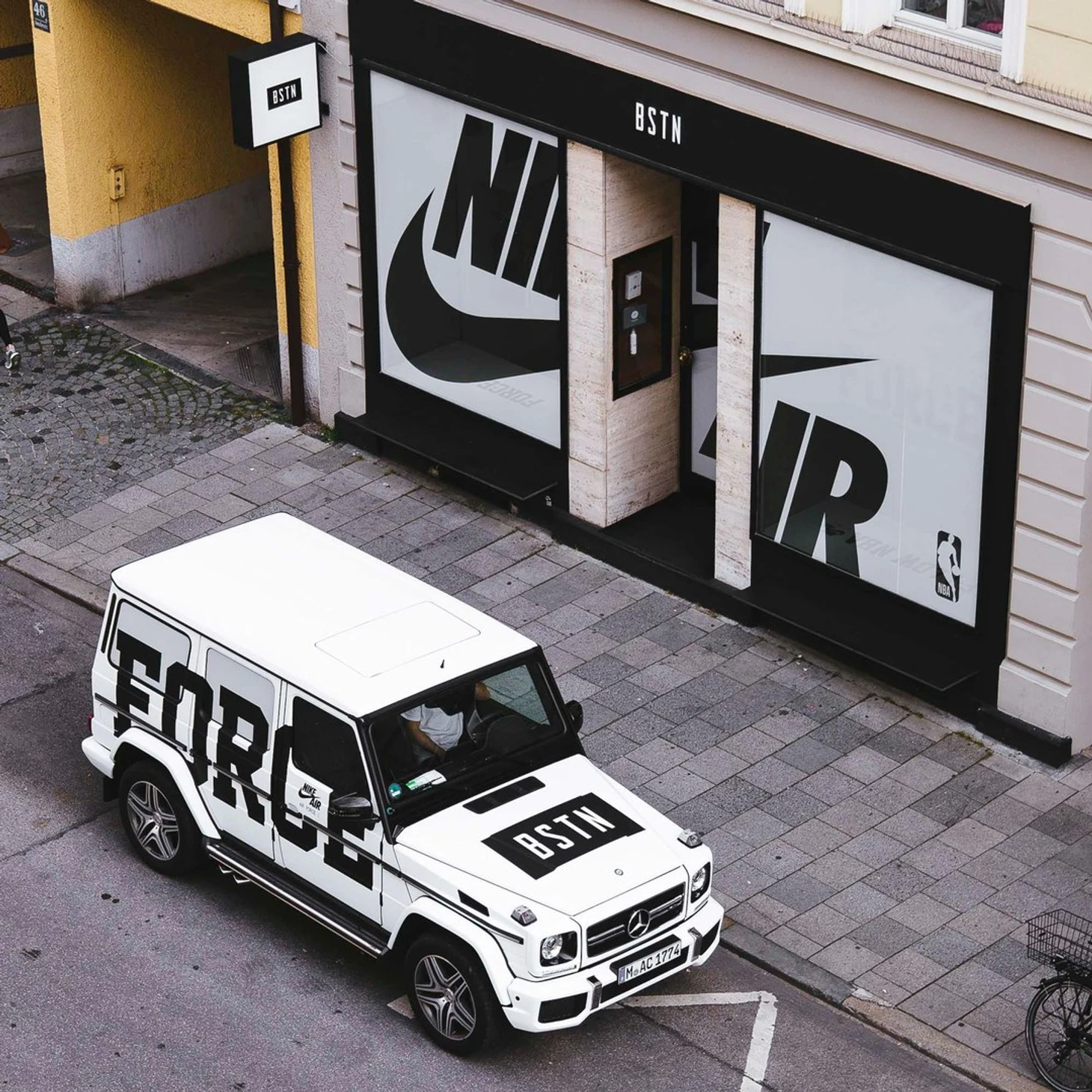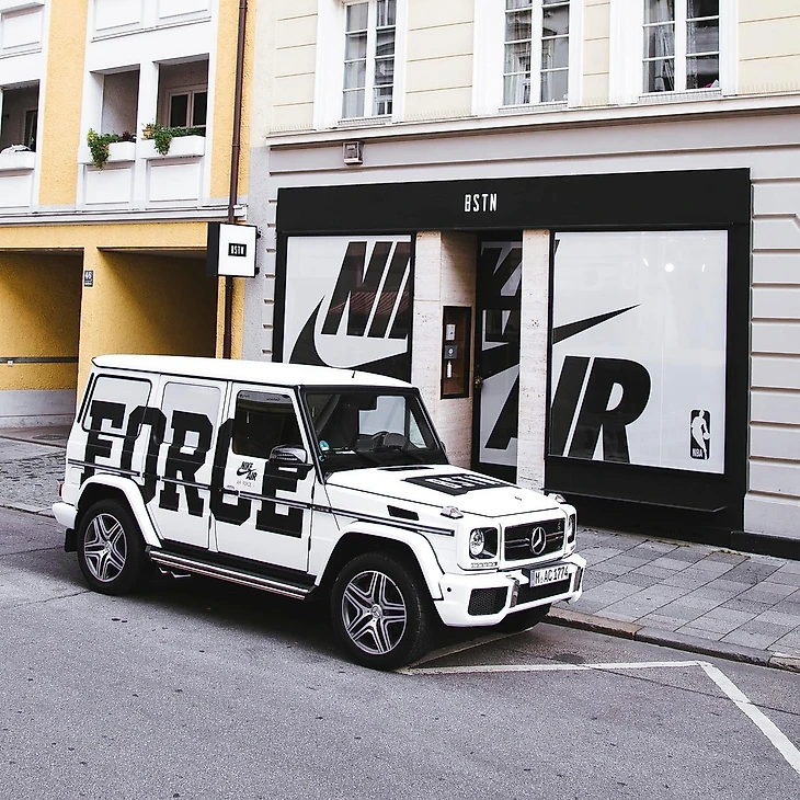 Они изменили полностью витрину и пригнали забрендированный Mercedes Gelendwagen. Теперь там надпись Nike Air Force.