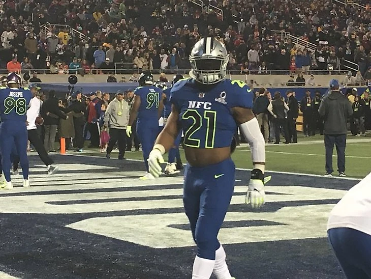 Во время матчей Эллиотт часто заправляет низ формы под защиту. Он говорит, что так ему удобнее. Например, так он выглядел в прошлогоднем Про Боуле (матче всех звезд НФЛ).