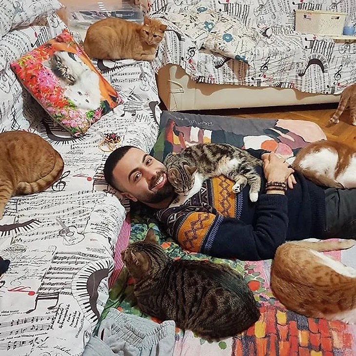 Музыкант Сарпер Думан (Sarper Duman), живущий и работающий в Стамбуле, прославился в Интернете благодаря своим 9 спасенным с улицы и из приюта котам и кошкам, которые обожают музыку и своего неотразимого хозяина.