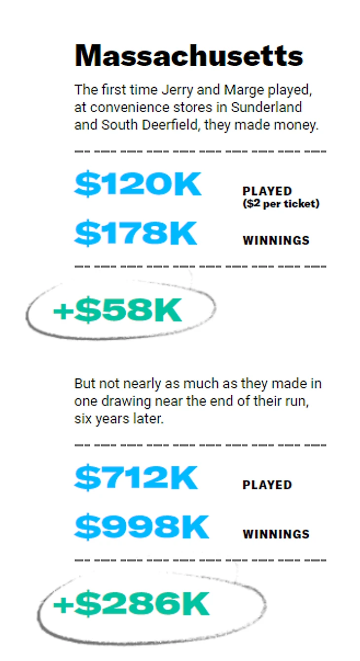 31 июля вышла статья в Boston Globe, в которой упоминались Джерри, Мардж и Лу. Исследование Эстес показало, что лотерея Cash WinFall статистически гарантировала прибыль любому человеку, готовому потратить на билеты во время роллдауна больше $100,000. Получается, возмущалась Эстес, обычные люди субсидировали крупных игроков, покупая билеты небольшими партиями и в неудачные моменты. Она связалась со Шриваставой, канадским статистиком, и цитировала в статье его слова: «Cash WinFall не является игрой шанса. Несколько хитрецов нашли способ обогащаться, в то время как все остальные невольно их финансировали».