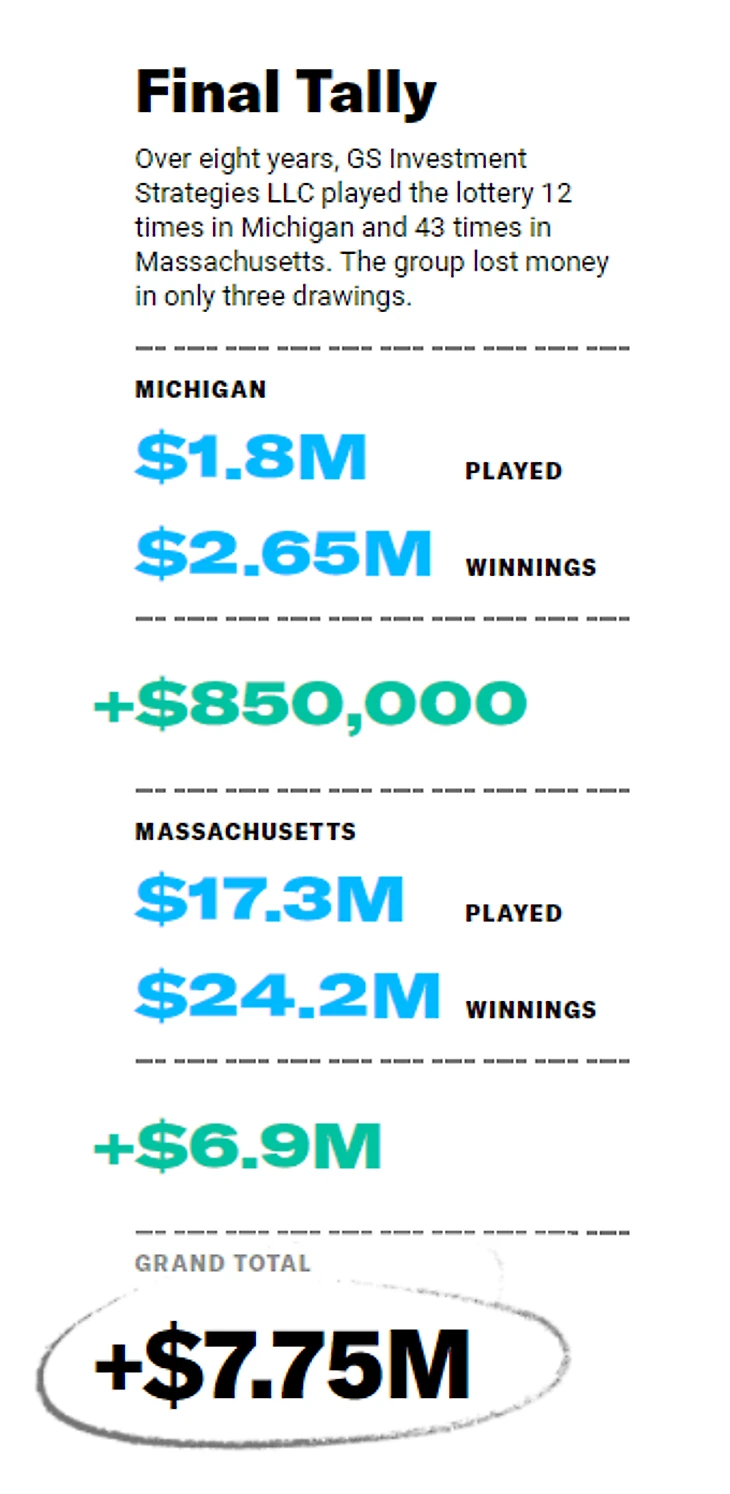 За восемь лет компания GS Investment Strategies LLC 12 раз сыграла в Мичигане и 43 раза в Массачусетсе. Только три розыгрыша оказались минусовыми. Общая прибыль в Мичигане составила $850,000, в Массачусетсе – $6.9 млн. Итогом их карьеры стала прибыль $7.75 млн, выплаченная всем акционерам GS Investment Strategies LLC.