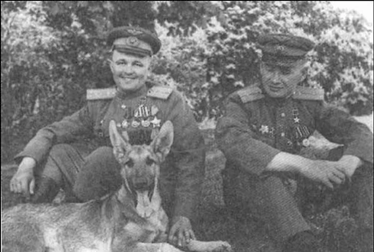 Михаил Лусто (слева) и Евгений Мариинский с собакой Джульбарсом. 1945 г.