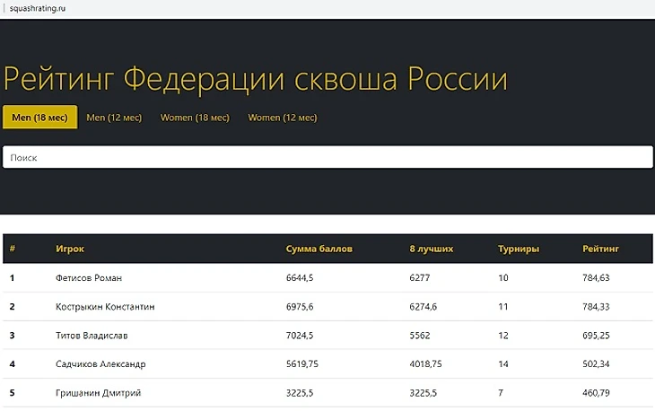 ⇑ - вот такой адрес сайта с официальным рейтингом сквоша России