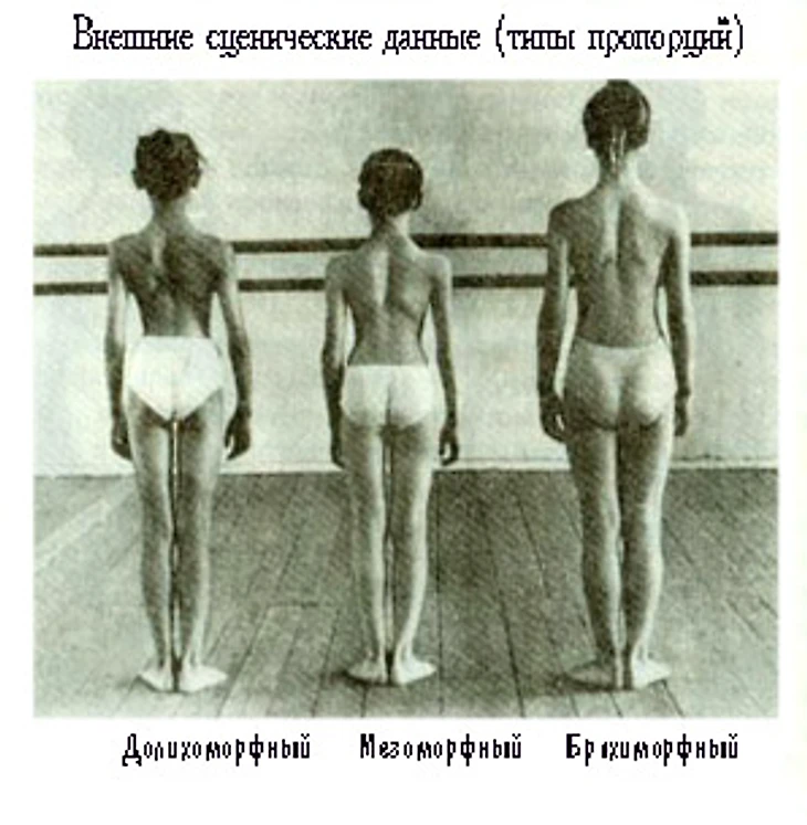 телосложение. Тело каждого ребенка тщательно изучается комиссией в четырех ракурсах: лицом, спиной и с обоих боков. Предпочтителен долихоморфный тип сложения: узкокостный, с нормальным или слегка удлиненным корпусом, узкими плечами, удлиненными ровными ногами и руками, тонкими кистями, пальцами рук