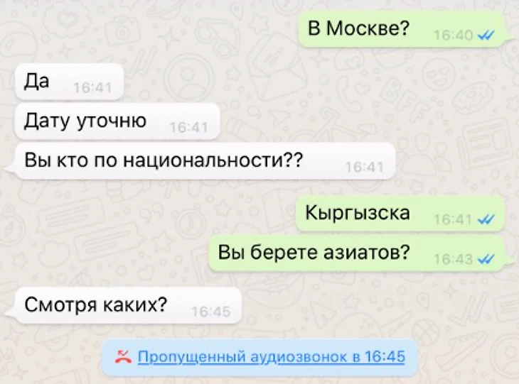 А. сказала, что ее бывший сокурсник получил аналогичный ответ, а девушка, которая отправляла резюме в другой российский театр, прошла до последней стадии отборов и слетела. Как и все соискатели с восточным типом внешности, которые участвовали в конкурсе.