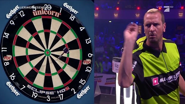 Хотя сам МВГ в тот вечер выдал нечто потрясающее. В одном из легов голландец вышел на закрытие 69 очков, но после попадания в T19 зачем-то бросал в D11, а не в D6. Бурное празднование ван Гервена прервал судья Джордж Нобл, указавший на перебор. Дальше смотрите сами – это видео можно крутить на репите до бесконечности.