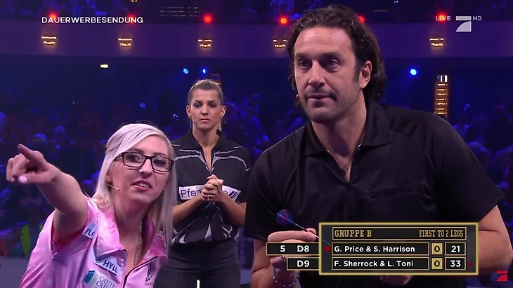 Вот, например, Фаллон Шеррок показывает своему напарнику Луке Тони, куда лучше бросать дротик. На заднем плане Сара Харрисон, если кто не знал.
