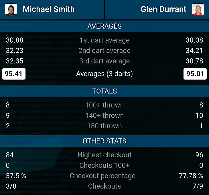 Хороший и уверенный старт для Дюрранта как дебютанта. Очень качественная игра на удвоениях. Майкл же бросал очень резко и нервно, и пока с такой игрой он является основным претендентом на вылет.