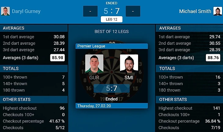 Ура! Мы ждали этого более четырех сезонов Премьер лиги! Майкл Смит сыграл идеальный лег за 9 дротиков! Не зря в прошлых турах Майкл неплохо разминался и закрыл несколько легов за 10 дротиков. Правда, что-то ещё хорошее о данном противостоянии сказать трудно. Весь матч оба игрока аккуратно брали леги на своих началах. Но в двенадцатом леге Дэрила просто напросто выключило, было ощущение, что Гёрни просто сдал игру, уж очень плохо он провёл последних лега. Объяснить это не представляется возможным