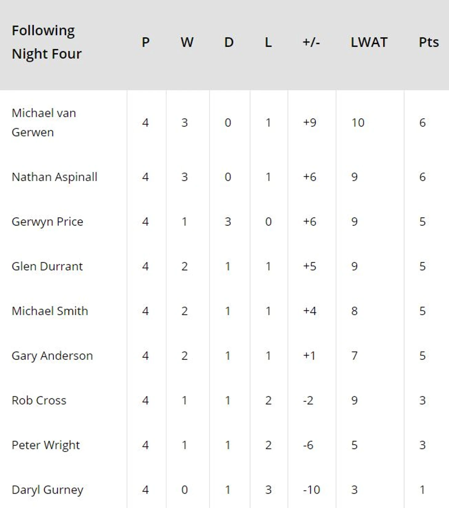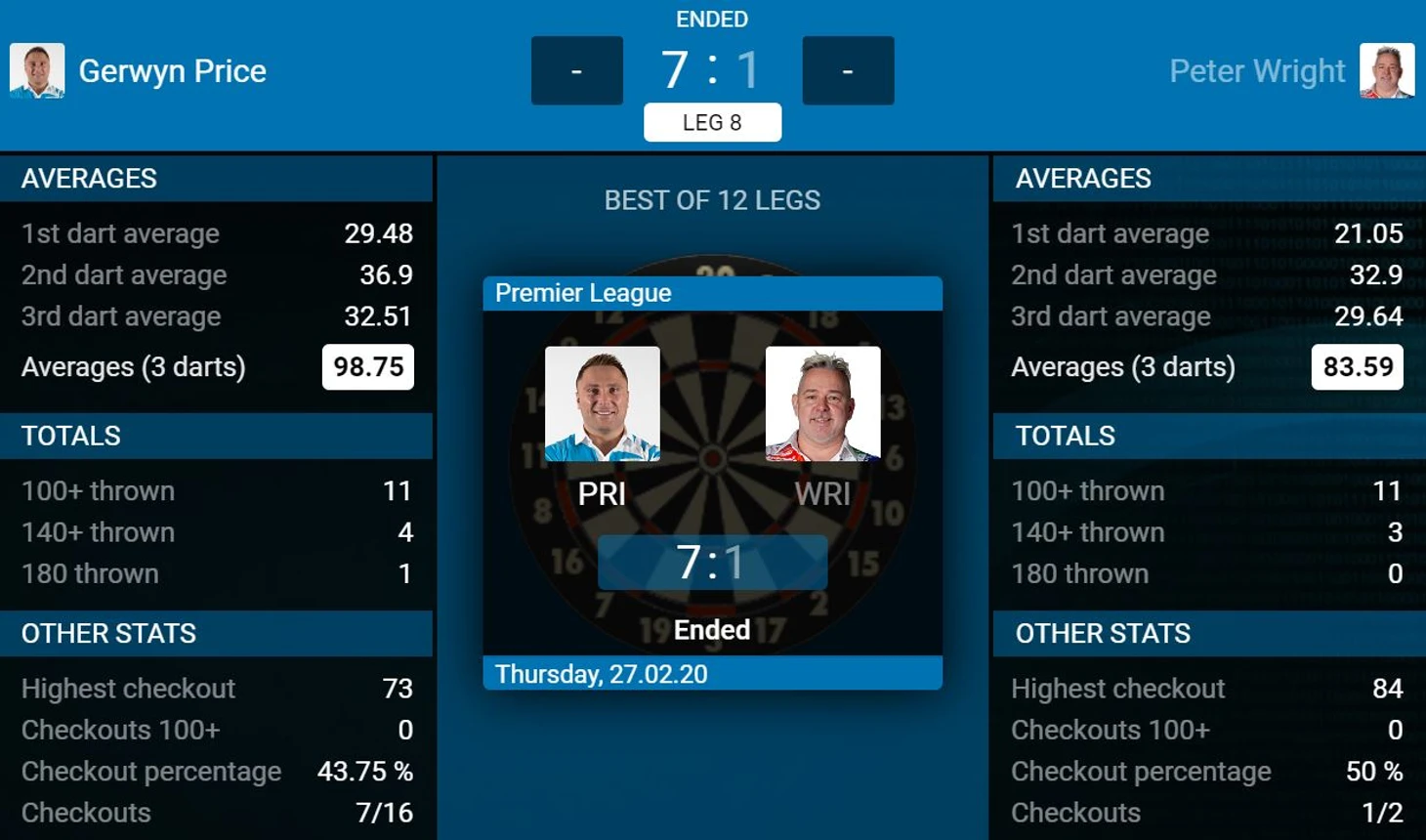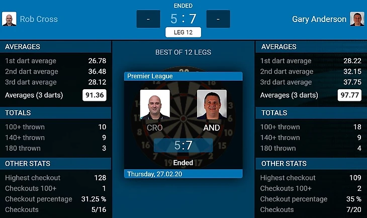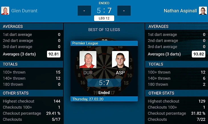 После четвёртого лега во время работы дартсдаты произошёл сбой, поэтому статистика по набору для каждого дротика не показана. Глен имел прекрасную возможность продолжить лидерство в лиге, но после сбоя в игре в пятом леге (очень символично вместе с дартсдатой) упустил возможность комфортно повести со счётом 4-1. "Аспи" прекрасно воспользовался ситуацией и смог даже смело урвать победу. Своим проигрышем Глен лишился лидерской строчки, а вот Нэйтан уверенно идёт к месту в плэй-офф.