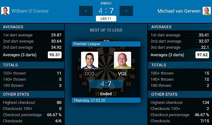 Майкл снова вернул себе лидерство в лиге. Качество его игры опять было ниже его возможностей, но сейчас этого хватило для победы. Местная ирландская публика пыталась сильно морально давить на действующего четырёх подряд кратного чемпиона лиги, но этого хватило лишь на небольшую интригу в середине встречи. Несмотря на неплохую игру, Уильям в этой лиге запомнится в основном классным выходом на сцену.