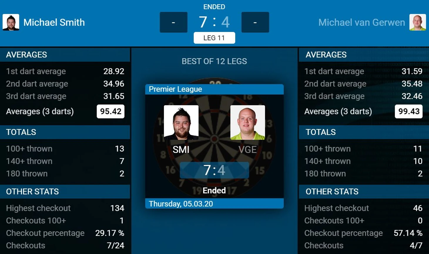 Очередное поражение "Зелёной машины", но на этот раз уже не такое сенсационное. Смит уже обыгрывал ван Гервена на прошедшем недавно Европейском туре PDC в Бельгии, обыграл и в этот раз. Посмотрев статистику, можно подумать, что Гервен проиграл очень незаслуженно, все статические показатели у него выше, чем у Смита, но эти цифры обманчивы, т. к. ван Гервен просто показывал максимальный результат в победных легах, в остальных случаях его игра оставляла желать лучшего. Похоже ещё не привык "Могучий Майк" к своим новым дротикам. Здесь необходимо отметить неплохую игры Смита, которая растёт в результатах с каждым днём, но странные проблемы с психологией пока сильно портят не только статистику, но и общее впечатление от игры. Болельщикам Смита, наверное, приходится за сердце хвататься на каждом его закрытии. Просто посмотрите концовку матча и Вы всё поймёте.