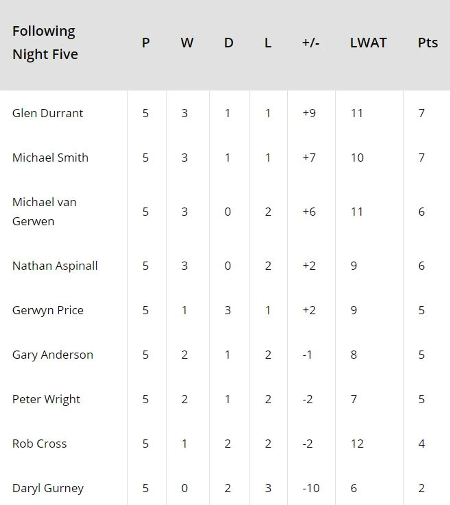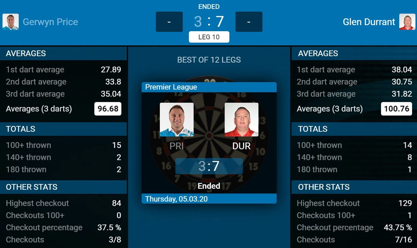 Дебютант лиги Дюррант снова приятно удивляет. На этот раз он нанёс первое поражение Гервину Прайсу. Глен очень уверенно начал поединок, поведя в счёте 4-0. Отыграть у "Дуззы", который находится в хорошей форме, такой отрыв вряд ли возможно. Прайс смог только лишь победить на собственных началах, Глен достаточно хладнокровно довёл встречу до победы, и благодаря осечкам оппонентов снова вернулся на первое место в турнирной таблице!