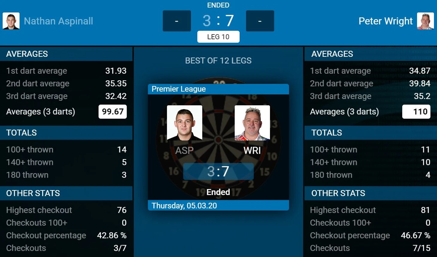 Делать ставки на игры с участием Питера Райта - дело неблагодарное. На прошлой неделе у Питера не летело вообще ничего и абсолютно слил игру Прайсу. На этот раз прилетело всё, что можно и даже больше.По-настоящему чемпионской игрой от Питера можно было просто насладиться. Нэйтану даже посоветовать нечего, что можно противопоставить против такой игры оппонента.