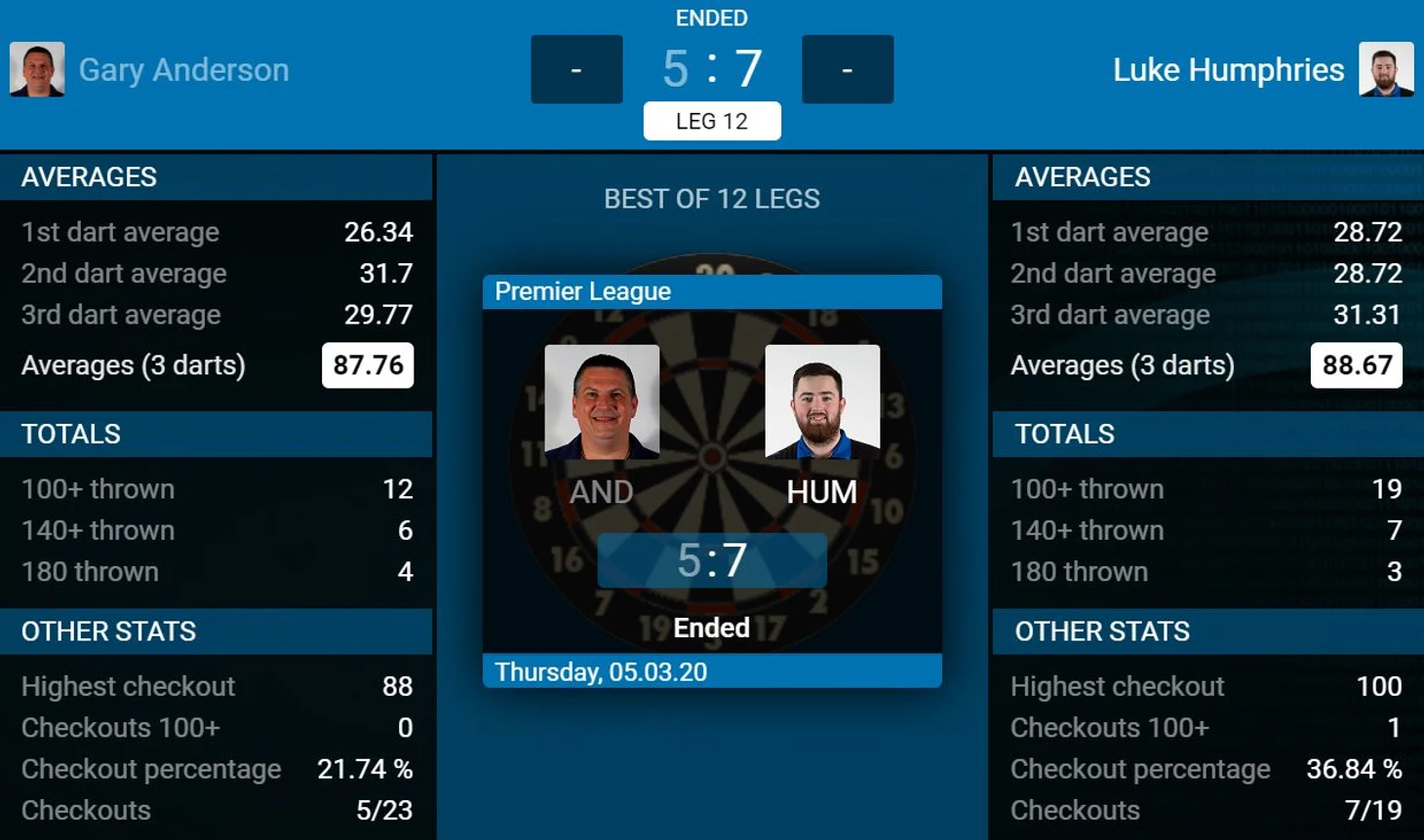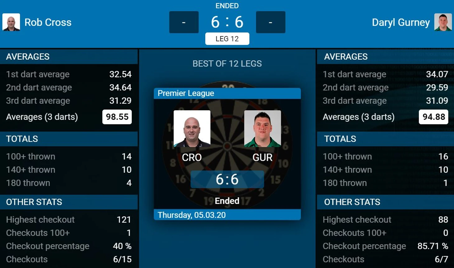 На матч, а сплошные качели. Сначала первые три лега взял Герни, потом Роб ответил четырьмя. Вообщем ничья - закономерный результат. Правда обоим дартсменам это сильно не помогло, теперь они оба находятся в подвале турнирной таблицы.