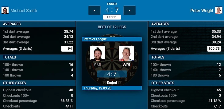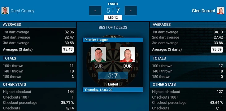 Дебютант Дюррант непостижимым образом продолжает взламывать лигу. На этот раз не без труда, но обыгран аутсайдер. При этом по игре трудно было сказать, что играют два дартсмена, один из которых лидер, а второй находится на последнем месте. Играли оба примерно на оном уровне, наверное, поэтому Премьер лига является одним из самых интересных дартс мэйджор туриром. Несмотря на крепкое сопротивление от Гёрни, Глен отлично закрывался и закономерно победил в матче и всё ещё продолжает лидировать, на этот раз уже единолично!