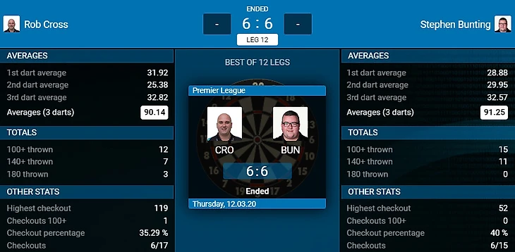 Ещё одна ничья в копилку приглашённых игроков. На этот раз её заработал бывший чемпион мира БДО Стефен Бантинг. Игра не получилась выдающейся, Роб до сих пор не может найти свой приличный дартс и вытягивает игры благодаря неплохих окончаний. Нужно отметить, что именно Бантинг отыгрывал ничью в матче, но сказать, что он был слабее нельзя. На фоне сегодняшнего Кросса он смотрелся весьма прилично.